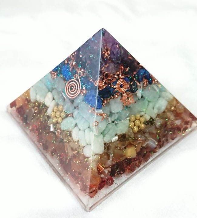 チャクラの活性化を促すよう一色一色にエネルギーを込めた石を丁寧に埋め込み、更に宇宙と繋がるようピラミッド型に仕上げました。 製作に4日間掛けています。 世界にたった一つだけのオリジナルオルゴナイトです。 《生命の誕生》…