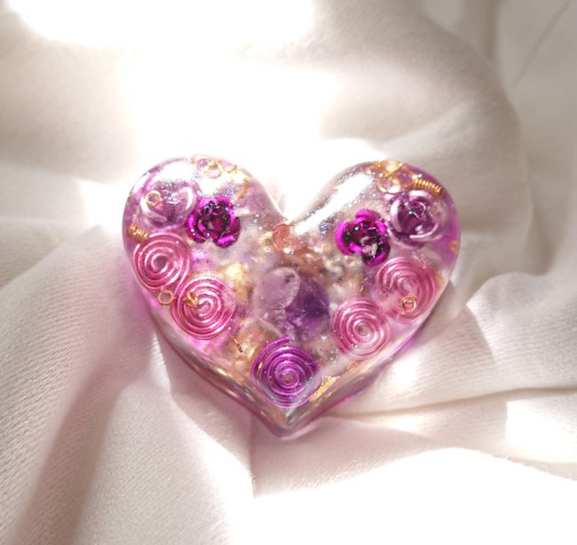 チャクラカラーオルゴナイト・ハート❤ 第七チャクラ・紫 体のチャクラ色のオルゴナイトを持つことによって、ピンポイントでのエネルギーの活性化をイメージして製作しています。 染料は使用せず、ジェムストーンとワ…