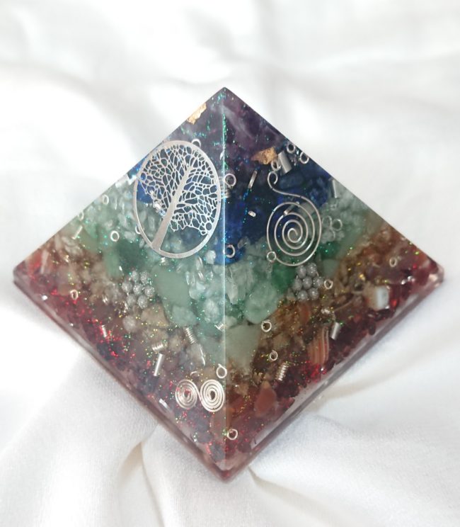 チャクラの活性化を促すよう、一色一色にエネルギーを込めた石を埋め込み、更に宇宙と繋がるようピラミッド型に仕上げました。 製作に4日間掛けています。 世界にたった一つのオリジナルオルゴナイトです。 《生命の…