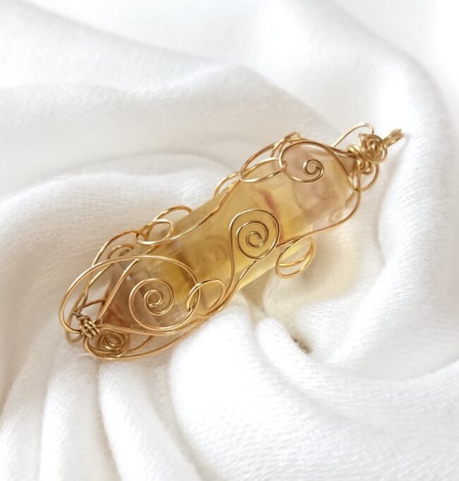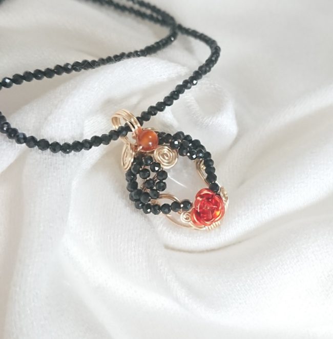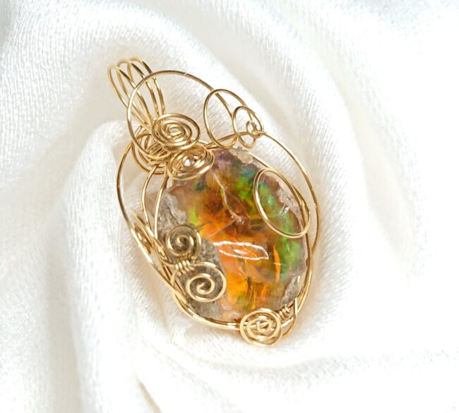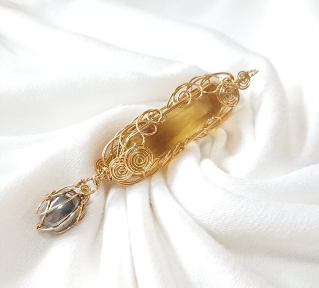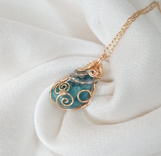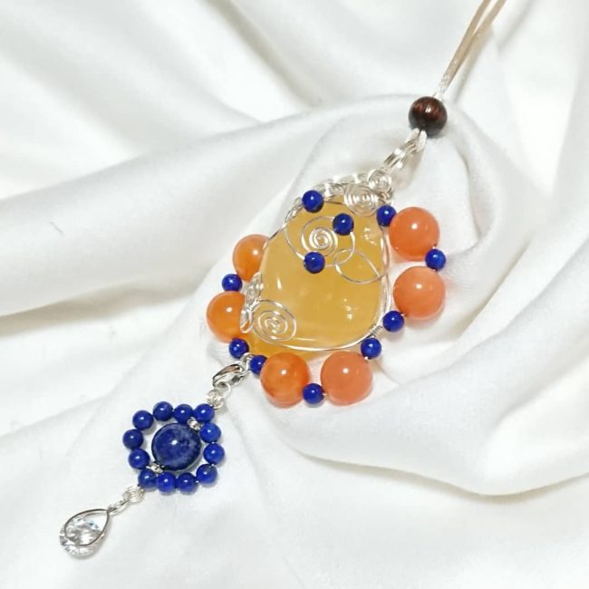 オーダーメイドでお創りしました。 今回は、お客様の生年月日から導き出したお色やジェムストーンを基本に、選択し使用しています。 お客様への私のイメージと合わせ、デザインを決め、導き出した石をワイヤーでラッピングしています。…