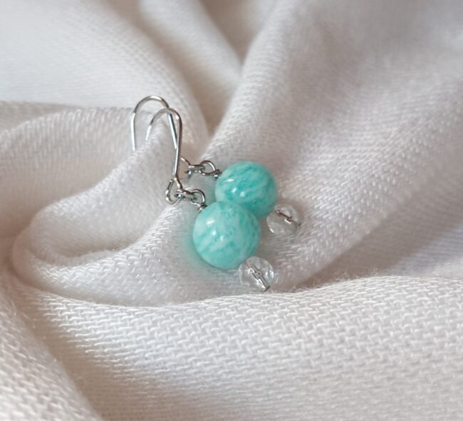 アマゾナイトとクリスタルのピアスです 霜降りのような模様がまた魅力的。さわやかなブルーのアマゾナイトは「希望の石」「行動の石」と言われています 迷いを取り去り、進むべき道へと導いてくれ、未来への希望をもたらせてくれます。…