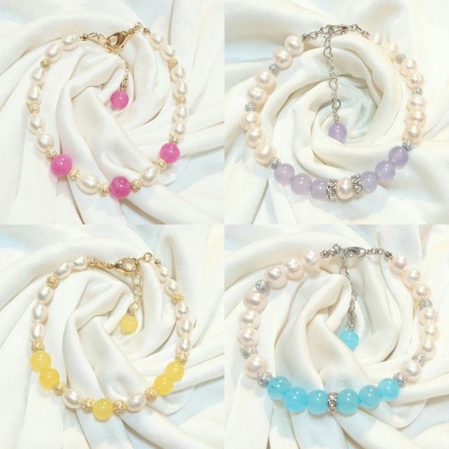 淡水パールブレスレッド 染めクオーツと淡水パールで紡ぎました クオーツがとてもキュート♪ ピンククオーツ:¥5,000 イエロークオーツ:¥5,000 ブルークオーツ:¥6,000 パープルクオーツ:¥6,…