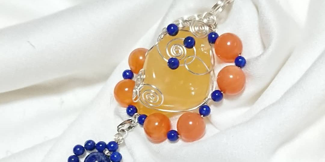 こちらの作品は、ラピスラズリ・カーネリアンがお客様の石で、真ん中のオレンジカルサイトがお客様のお色です。また、ワイヤーのシルバーもお客様のお色でした。